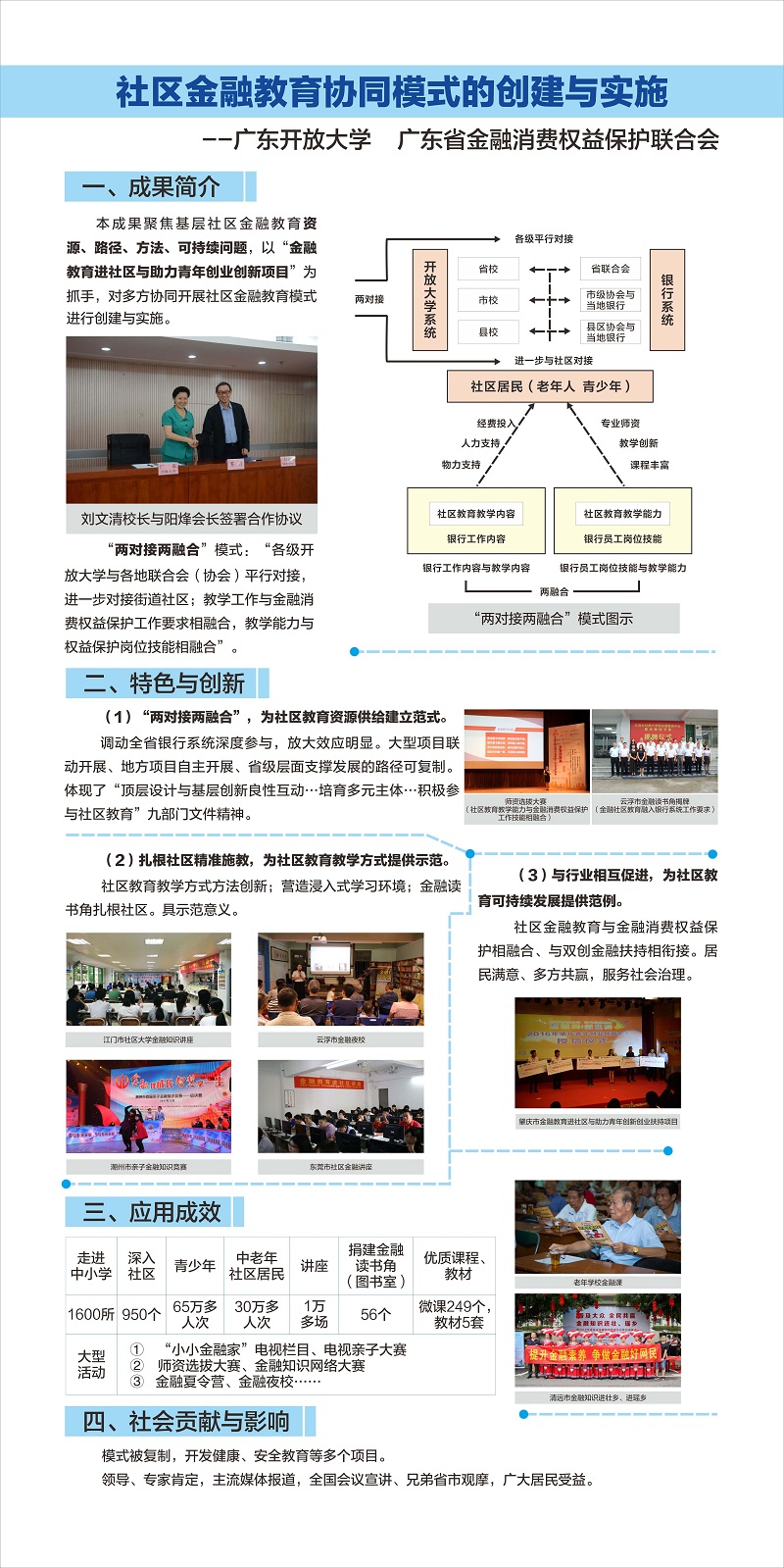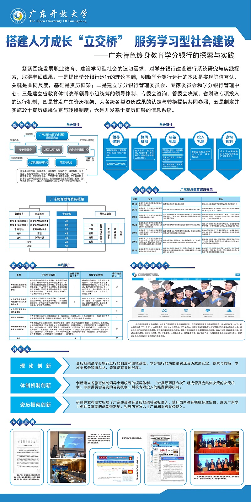 11月22日在广州举行的2019年全民终身学习活动周广东省开幕式公布了2019年广东教育教学成果奖“社区教育和老年教育”类评比结果。学校党委副书记、校长刘文清研究员主持的“‘混合多元 学养结合’的老年教育模式探索与实践”和李江研究员主持的“搭建人才成长‘立交桥’,服务学习型社会建设——广东特色终身教育学分银行的探索与实践”均获一等奖;工程技术学院院长王建根教授主持的“社区金融教育协同模式的创建与实施”获二等奖;中山开放大学、佛山开放大学等也有3个主持项目获得二等奖。学校获奖数量高达总设置奖项数的一半,取得历史性突破,也充分体现了省开放大学体系转型发展及学校一流开放大学建设取得的显著成效,具有历史性意义。