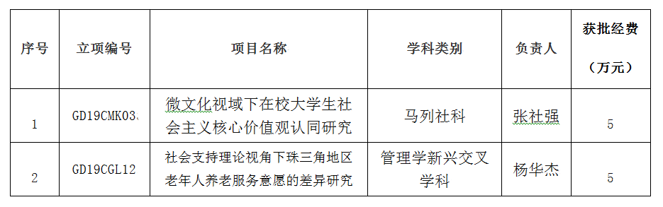 我校喜获佳绩,首获2项一般项目立项,分别为张社强老师申报的《微文化视域下在校大学生社会主义核心价值观认同研究》和杨华杰老师申报的《社会支持理论视角下珠三角地区老年人养老服务意愿的差异研究》。