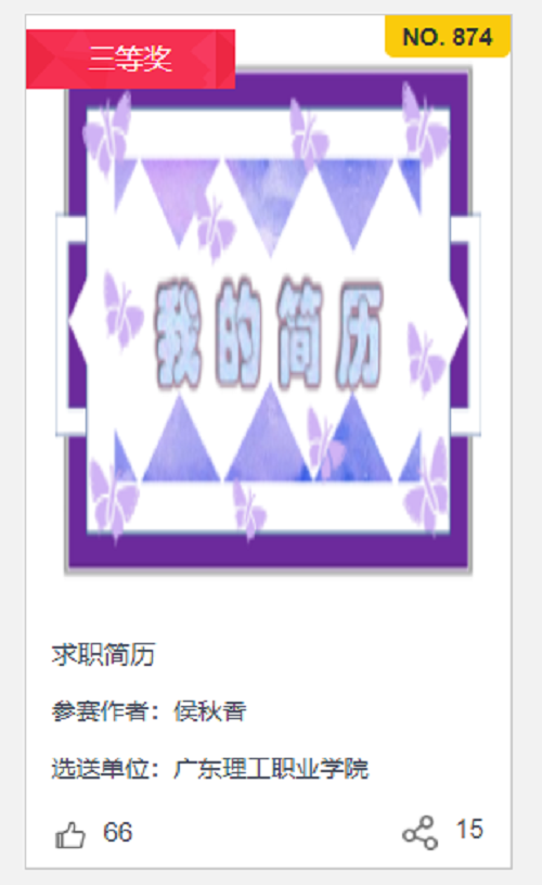 近日,在“软件通杯”第五届广东省职业院校简历创意设计大赛上,我校健康产业学院老年服务与管理专业2020级学生侯秋香荣获三等奖。