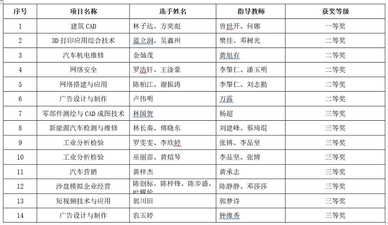 日前,广东省教育厅公布了2021-2022年度省职业院校学生专业技能大赛获奖结果。学校中职教育部(广开附属职校)学子取得优异成绩,共获一等奖1项、二等奖5项、三等奖8项。