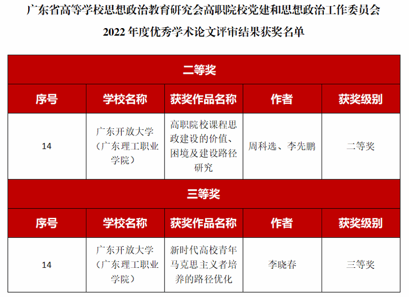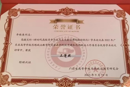 其中,学校经济管理学院教师周科选、李先鹏提交的《高职院校课程思政建设的价值、困境及建设路径研究》荣获优秀学术论文二等奖;马克思主义学院教师李晓春提交的《新时代高校青年马克思主义者培养的路径优化》荣获优秀学术论文三等奖。