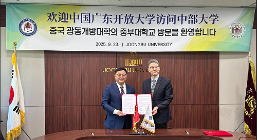 在韩国中部大学,出访团参观了学生服务中心、教学实训设施,并与该校校长李桢烈会谈。幸小涛介绍了学校办学基本情况,以及近年来在开放教育和职业教育教学科研方面取得的成绩。李桢烈对学校独特的办学优势和突出的办学成果表示高度赞赏,表达了强烈的合作意愿。双方共同探讨学历继续教育与数字学习平台建设方面的经验,洽谈共同开发跨境在线课程,共建健康服务、老年照护、康复等在线继续教育课程,并举行了校际合作签约仪式。
