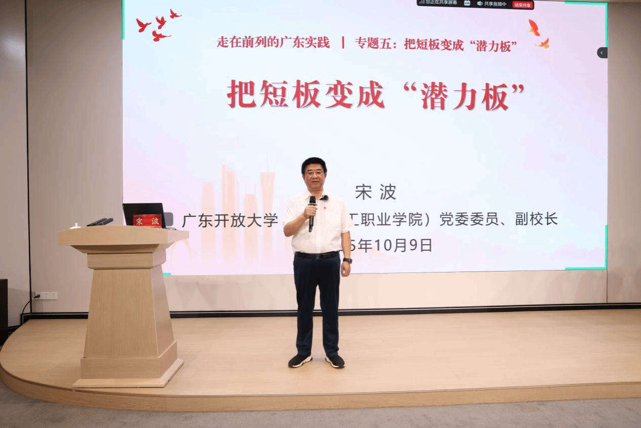 10月9日,学校党委委员、副校长宋波以《把短板变成“潜力板”》为题,通过线下和线上相结合的方式,向学校和全省开大体系学生讲授“思政第一课”,引导大家深刻领会习近平总书记对广东工作的重要讲话和重要指示批示精神,积极投身广东“百千万工程”。