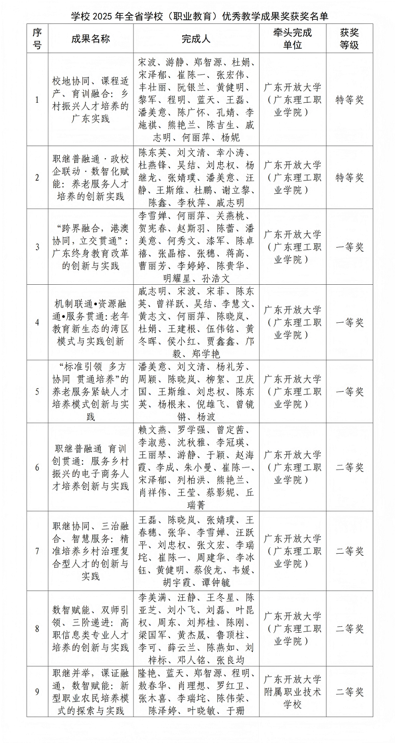 近日,省人力资源和社会保障厅、省教育厅联合发布《关于表彰全省学校优秀教学成果奖(基础教育与职业教育类)的决定》。其中,学校获奖9项,包括特等奖2项、一等奖3项、二等奖4项,获奖数量与等级均创历史新高,终身教育类以总量6项居全省首位。